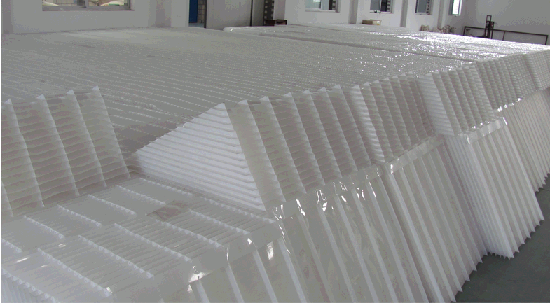 斜板填料主要由共聚及聚丙烯材料混合製成。從淺層理論的基礎講,在斜板上部設置沉澱距離合理的沉澱段,在下部控製斜板的幾何形狀,使斜板下部形成穩定的接觸絮凝段,通過接觸作用和淺池沉澱機理達到礬花與水分離的目的。各種間距斜板填料均是通過不同高度的塑料肋條來支撐斜板片,肋條與斜板熱熔焊接,每兩層斜板片之間需要多根肋條支撐,組裝工藝複雜,而且傳統斜板內部水流流道成矩形,常適用於上向流沉澱池。 斜板填料規格參考表(備注:斜長為1m計算) 片厚(單位:mm) 平板(單位:張) 重量(單位:kg) 肋條(單位:根) (板間距)25 0.8 32 33 7 1 32 39 7 (板間距)28 0.8 30 32 7 1 30 37 7 (板間距)30 0.8 28 30 7 1 28 35 7 (板間距)50 1 18 26 7 (板間距)80 1.5 11 25 7 (板間距)100 2 8 24 7